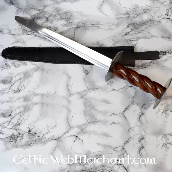 Denne Dolk er en kopi af en typisk 14. århundrede Dolk. Den blev båret af mange mennesker, fra købmand til ridder. Den blev primært brugt til selvforsvar, men det kunne også drages i kamp. Denne Dolk er helt håndgjort og egnet til nyopførelse slag. Dens længde er 42 cm, og det har en klingelængde på 30 cm. Vejviser Produkt detaljer: