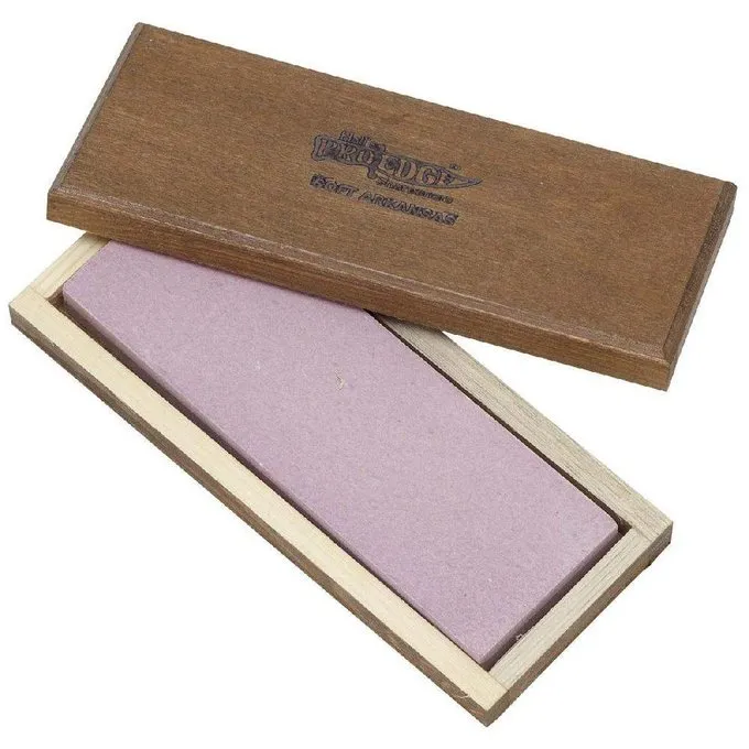 En naturlig Arkansas hvæssesten, egnet til grov og fin slibning og polering. Denne sten har et gran mellem 6000 og 8000 og måler 15 x 5 cm. Den leveres med en trækasse.