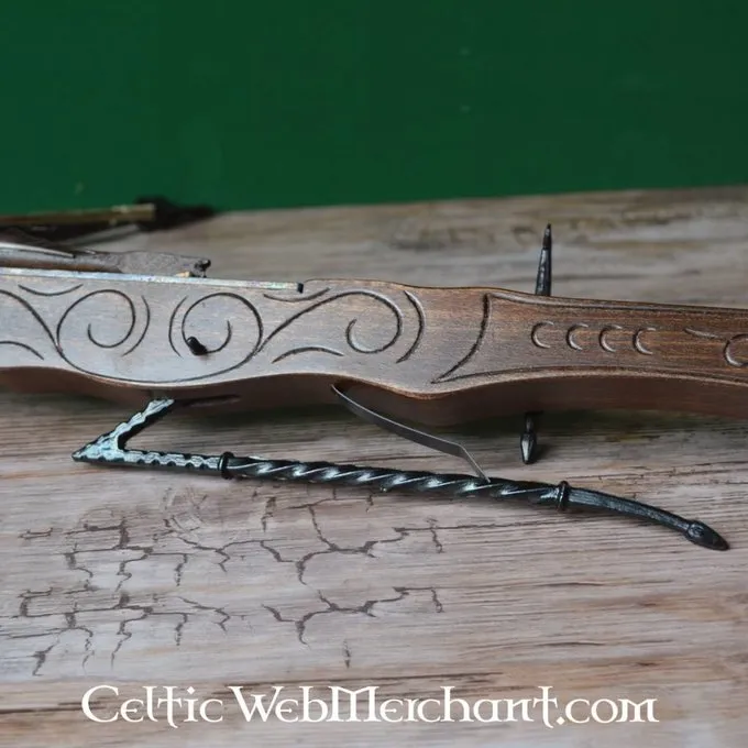 Længden af denne dekorative armbrøst 88 cm. Den er forsynet med jern lemmer.