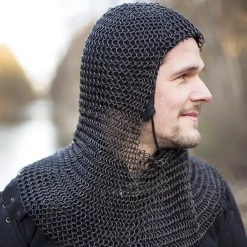 Denne coif er fremstillet af 1,6 mm tyk galvaniseret gathered Runde ringe med en indre diameter på 9 mm. De er vævet fire i én. Den coif har en trekantet udskæring.