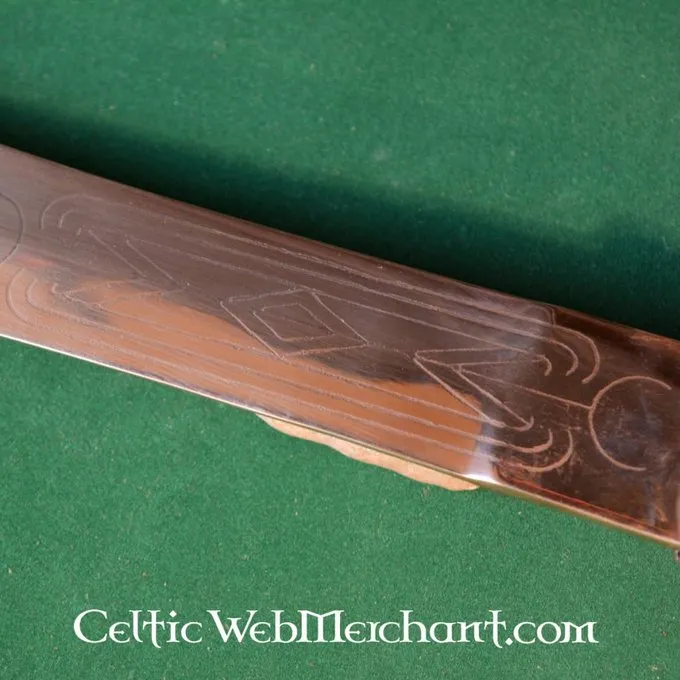 Produkt detaljer: Længde: 71,5 cm / Klingelængde: 58 cm / Grebets Længde: 13,5 cm / Vægt: 1450 g / Ståltype: Bronze / Kant: Halvskarpt / Tangkonstruktion: konstruktion with fuldt tang inclusief Knap / Grebets omvikling: Bronze / based on da historisk orig