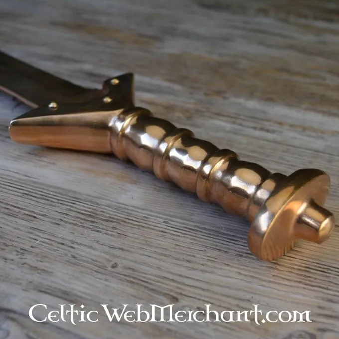 Produkt detaljer: Længde: 82 cm / Klingelængde: 66 cm / Grebets Længde: 16 cm / Vægt: 1480 g / Ståltype: Bronze / Kant: Halvskarpt / Tangkonstruktion: konstruktion with fuldt tang inclusief Knap / Grebets omvikling: Bronze / based on da historisk original