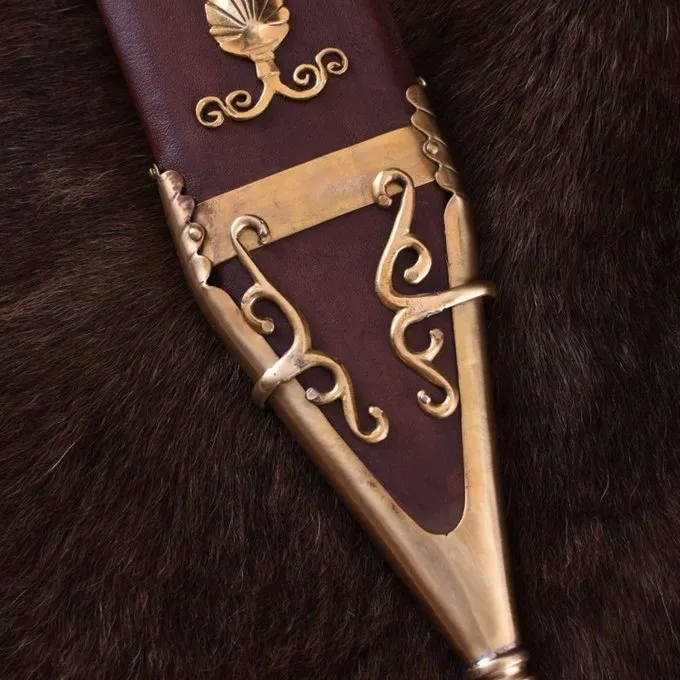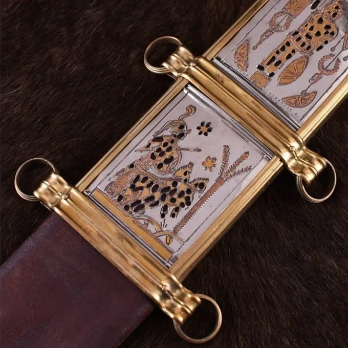 Denne luksuriøse gladius er et aktiv for samlere af klassiske våben og for romerske re-enactors. Det har en klinge af DA45 stål og en fæstet af ben og træ med en skruet knop. Den leveres med en læder skede med en træ kerne. Skeden er smukt dekoreret med messingbeslag. De to felter viser krigsførelse og sejr ikonografi. Den nederste firkant viser en fuldt bevæbnet figur på en stridsvogn. Den øverste kvadrat viser en fuldt bevæbnet tal omgivet af sejrende ikonografi, ligesom laurbærrene. Den nederste side er dekorativt, med en palmette og en dekoreret skede spids. Skeden har messing ringe, så du kan hænge det på dit bælte.