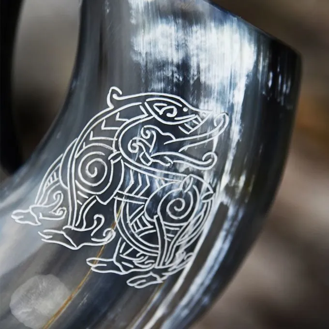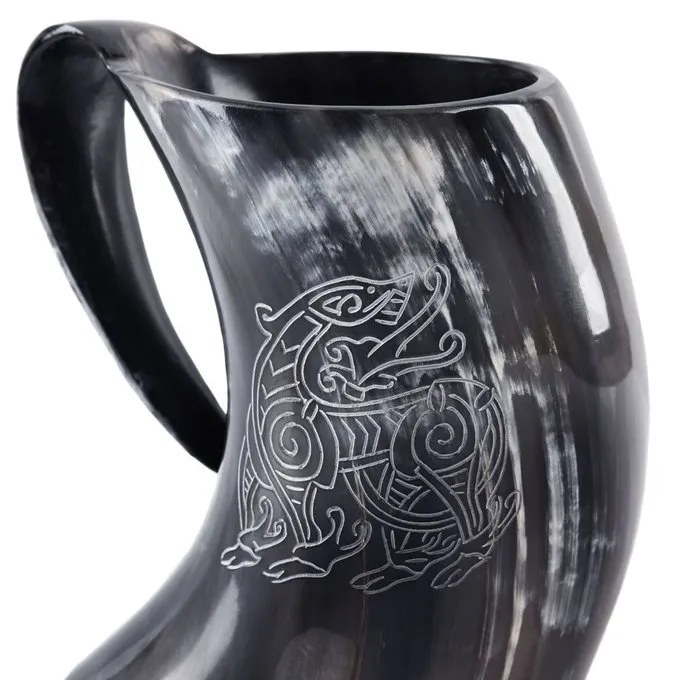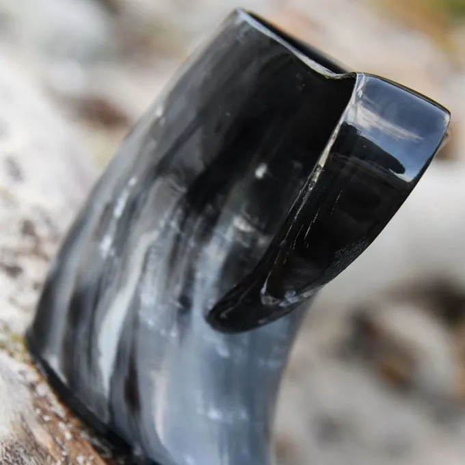 Denne smukke Horn Cup er håndlavet fra Buffalo Horn, poleret og indgraveret. Indersiden er forsynet med en lak, så du kan drikke kolde drikke fra den. Brug denne kop til LARP, festivaler eller til at nyde din yndlingsdrink derhjemme. Det er også et smukt dekorationsstykke og meget rart at give som en gave. Koppen er dekoreret med et drage -motiv. Dette er et populært motiv inden for vikingekunst og findes på smykker, sten og træværk.