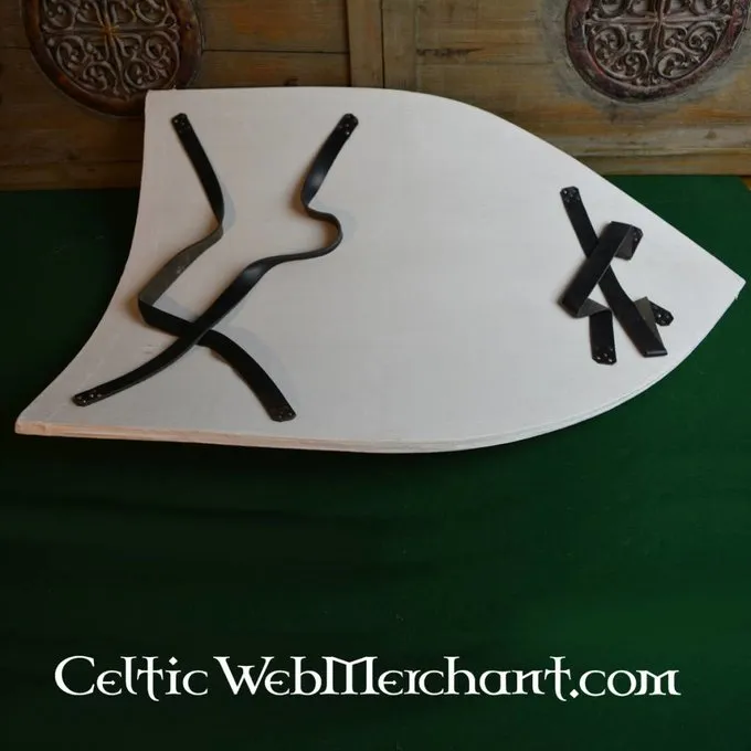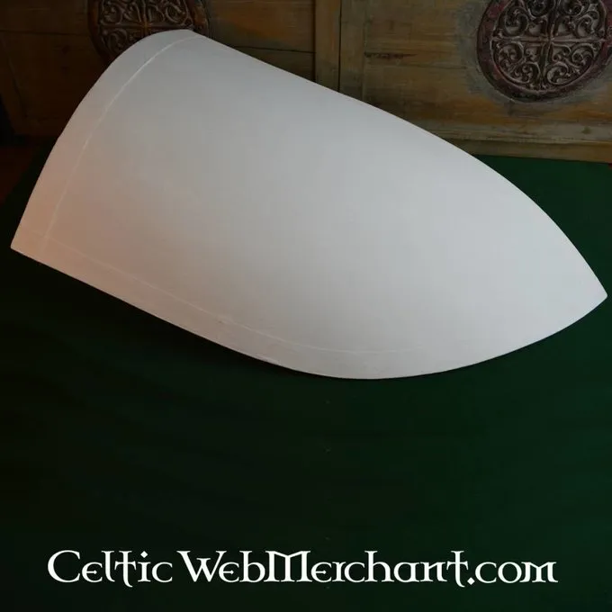 Denne kite Skjold er fremstillet af 1,2 cm tyk træplade. Den er malet hvid, så du kan nemt male det i den ønskede farve eller dine frakke-of-arme. Bagsiden har et greb. Skjold måler 68 x 51 cm og vejer 1,5 kg.