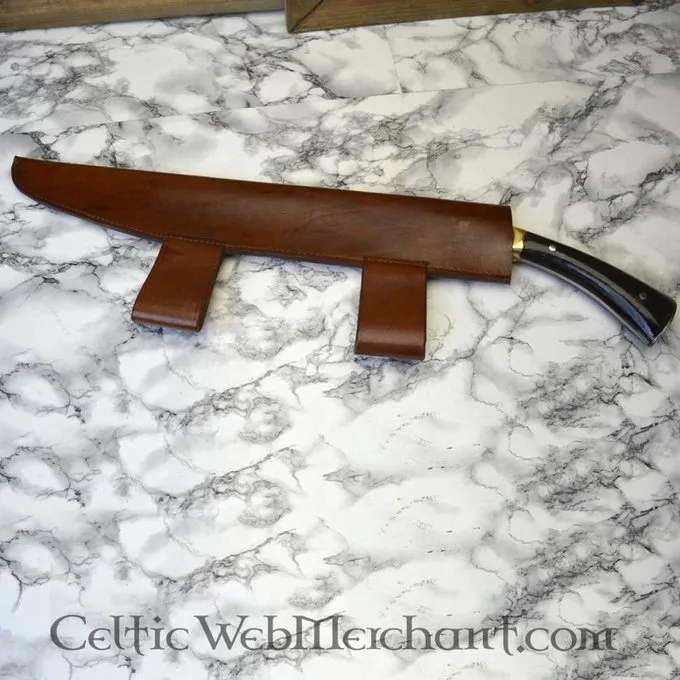 Produkt detaljer: Længde: 60 cm / Klingelængde: 44 cm / Grebets Længde: 16 cm / Klingens Bredde ub parerstangen: 5,5 cm / Vægt: 1350 g / Ståltype: DA45 kulstofstål / Kant: halvskarpt / Tangkonstruktion: konstruktion with fuldt tang / Greb: horn, messing /