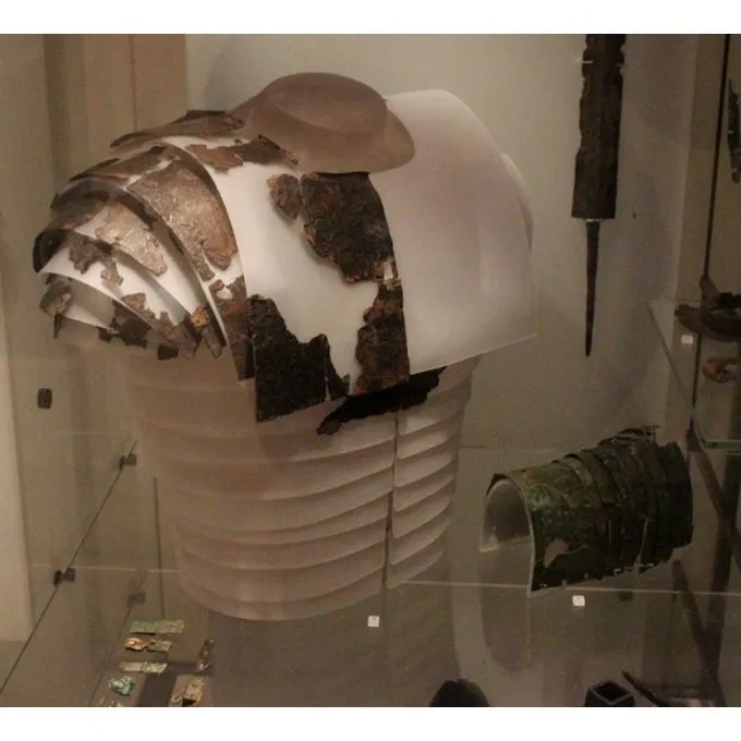 lorica segmentata blev båret fra 1stcentury e.Kr. af romerske legionærer. Denne type panserplade bestod af jern strimler, der var knyttet til den indvendige side på en læderrem. Dette er en rekonstruktion af en lorica segmentata fra slutningen 1stcentury e.Kr., der blev fundet i Newstead, Skotland. Den væsentligste forskel mellem denne type og er forgængere er, at Newstead lorica bestod af mindre? men større -. plader