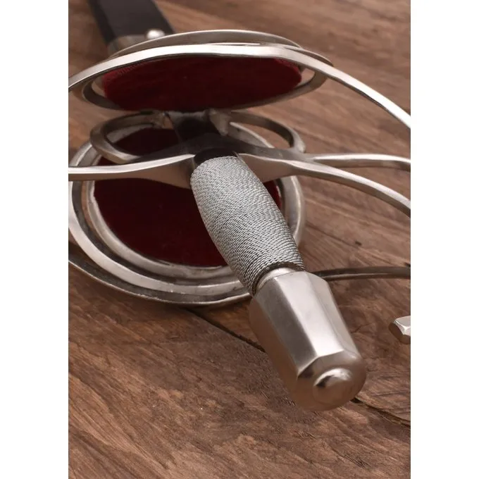 Typisk for Pappenheimer-rapier er formen på den kurvformede beskyttelse, der beskytter hånden. Denne dekorative rapier har et greb indpakket med ståltråd og et semi-skarpt blad med en skarp spids. Det leveres inkl. En træskår dækket med sort læder, skinden har stålkapsler.