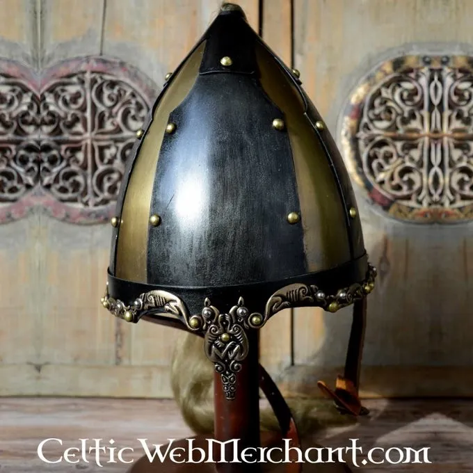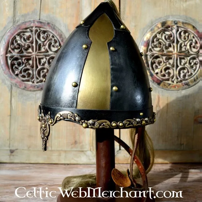 Denne Viking hjelm er baseret på originaler, der blev båret af den Rusvik, vikingerne i Rusland og Østersølandene områder. Den Kant af denne spangenhjelm er dekoreret med messing motiver. Denne Spangenhjelm har en hestehale lavet af ægte hestehår.