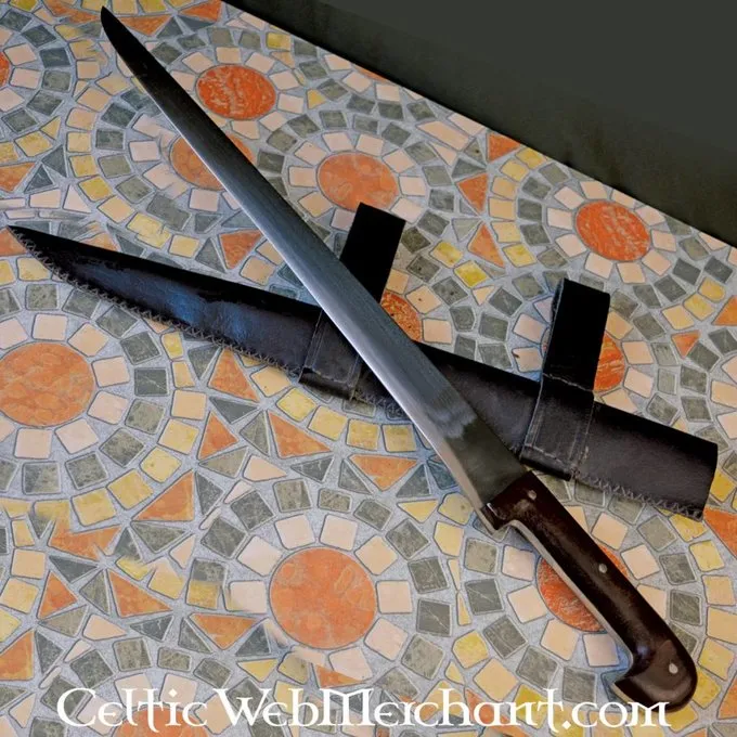 Produkt detaljer: Længde: 54,4 cm / Klingelængde: 41 cm / Grebets Længde: 13,5 cm / Vægt: 550 g / Ståltype: DA45 kulstofstål / Edge: halvskarpt / Tangkonstruktion: konstruktion with fuldt tang / Greb: horn, messing / based on da historisk original: ja /