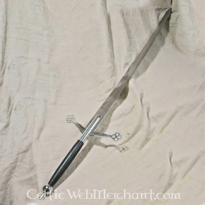 Produkt detaljer: Klingelængde: 105 cm / Ståltype: DA45 fjederstål, hårdhed 48 HRC / Kant: Halvskarpt / Tangkonstruktion: Konstruktion with fuldt tang / Knap: Skruet / Grebets omvikling: Træ, Læder / based on da historisk original: Ja /
