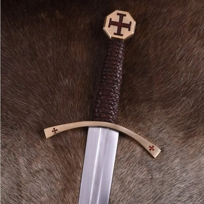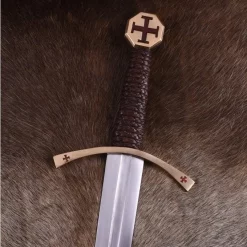 Dette dekorative Templar sværd har en kulstofstål klinge med en fyldigere. Grebet er lavet af træ og beklædt med flettet læder. Sværdet har en massiv cross-vagt og en ottekantet fæsteknap af messing. Både på tværs af vagten og de fæsteknap er dekoreret med røde emaljeret kors. Sværdet leveres inklusive en matchende skede. </ P>
