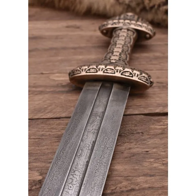 Detaljer: Længde: 97,5 cm / Klingelængde: 80 cm / Grebets Længde: 17,5 cm / Vægt: 1833 g / Ståltype: Damaskusstål 50 HRC / Kant: halvskarpt / Tangkonstruktion: Full tang / Knap: Skruet / Greb: Bronze / based on en historisk original: Ja