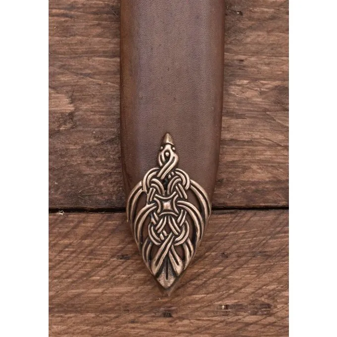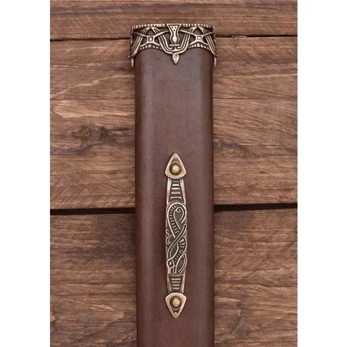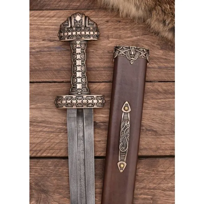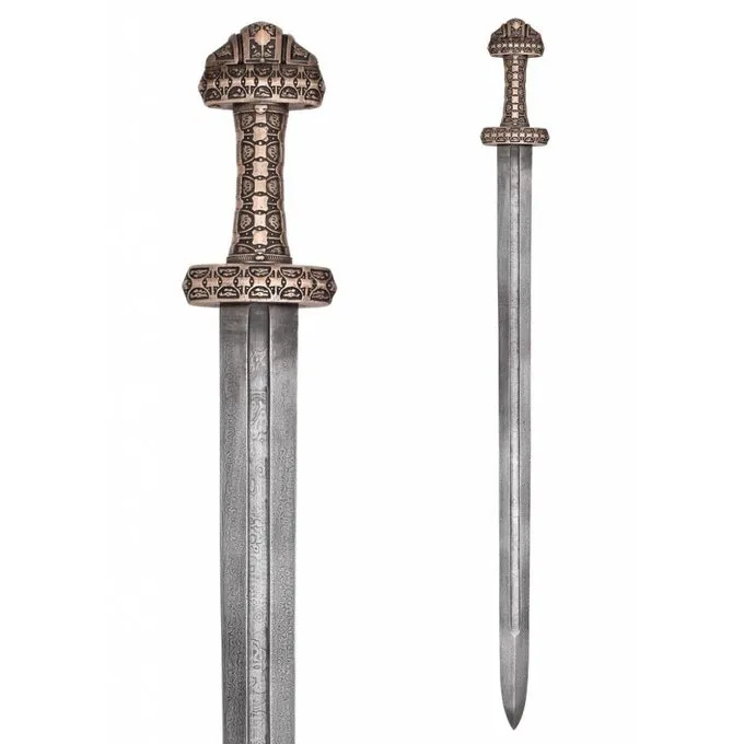 Denne Vikingesværd er en kopi af en original fra 9.-10. århundrede findes på øen Eigg, Skotland. Øerne i Hebriderne var en vigtig base for vikingerne og var en del af kongeriget Norges op til det 12. århundrede. De nordiske vikinger blandet med den gæliske befolkning. Denne luksuriøse sværd er ikke enestående. Lignende dekorerede sværd blev fundet over hele Viking-området. Denne Vikingesværd har et tyndt blad med en bred blodrille. Vagten og greb er lavet af bronze og er rigt dekoreret. Sværdet leveres inklusive skede. Vingen fremstilles af Damaskusstål. Ved at folde sammen forskellige hårde og bløde lag, bliver bladet en kombination af sejhed (hårdhed) og fleksibilitet.