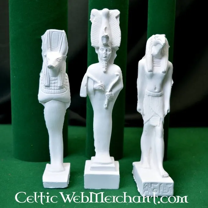 Disse gud statuer er kopier af originaler, der blev brugt i det gamle Egypten. Statuer som denne blev brugt til at ære guderne, de var objekter, der var afgørende for det daglige liv i en egyptisk. De tre statuer er: Isis, Osiris og Anubis. Statuerne er lavet af gips alabast og kan males.