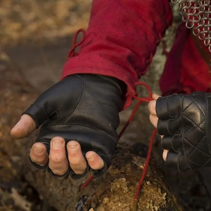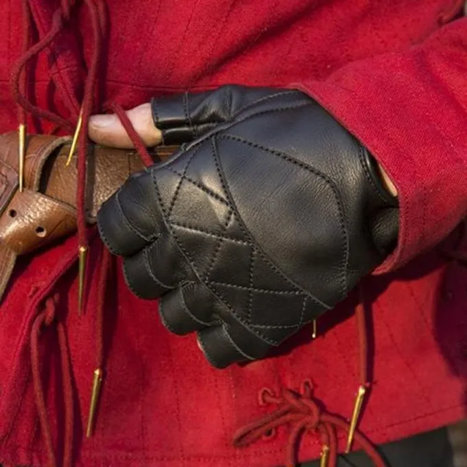 Disse praktiske fingerløse handsker er lavet af højkvalitets garvet læder. Har du brug for beskyttelse eller opvarmning af hænderne, men samtidig en maksimal fleksibilitet af hænderne og fingrene? Så er disse handsker det perfekte match. Handskerne har håndsømte sømme, hvilket gør materialet mere holdbart og mindre sandsynligt at rive eller skade. Omkring håndledet er der et spænde, der fastgør handsken. Disse handsker er et godt tilbehør til ethvert kostume.