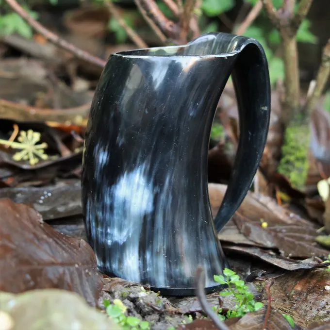 Håndlavede horn drikkebæger som anvendes i forskellige serier som vikinger, Game of Thrones og The Last Kongerige. 0,5 L af dine foretrukne drikkevarer passer i denne krus! Kruset har en praktisk øre til at holde det, og er specielt udvalgt for sin mørke farve. Det ydre er glat poleret til et luksuriøst look. Indersiden er også poleret og forsynet med et beskyttende lag, så det er egnet til indtagelse af drikkevarer. Dette krus er ikke egnet til varme væsker. Perfekt til festivaler, re-enactment, larp eller en doven aften på sofaen.
