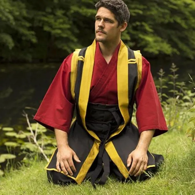 Denne Jin-Baori er lavet af bomuld og har dekorative slidser på skuldrene. Det når til lige under knæene. På bagsiden har slidser, så du kan flytte godt.
