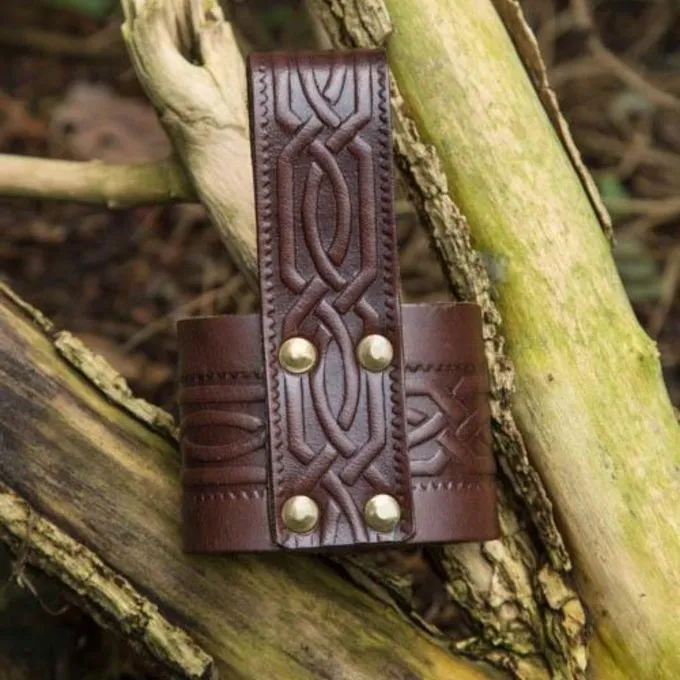Denne smukke luksuriøse læder drikkehorn indehaveren er dekoreret med en knude motiv i Viking stil. Den har en 7 cm bred bæltestrop, så du kan hænge det på dit bælte. Med denne holder har du din drikkehorn hurtigt ved hånden under festivaler og ved arrangementer. Med læder blonder kan du justere det til størrelsen på dit horn.