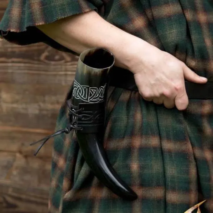 Denne smukke luksuriøse læder drikkehorn indehaveren er dekoreret med en knude motiv i Viking stil. Den har en 7 cm bred bæltestrop, så du kan hænge det på dit bælte. Med denne holder har du din drikkehorn hurtigt ved hånden under festivaler og ved arrangementer. Med læder blonder kan du justere det til størrelsen på dit horn.