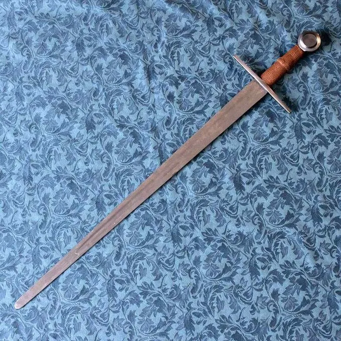 Dette kampklare sværd er lavet til genindførelse. Sværd som dette blev brugt af ridderne siden det tidlige 12. århundrede. Grebet er lavet af hårdttræ, og læderindpakningen har en ekstra fortykning, så det ligger godt i hånden. Bladet er lavet af 54SICR6 kulstofstål med en hårdhed på 50 HRC. Spidsen er stumpet for ekstra sikkerhed.