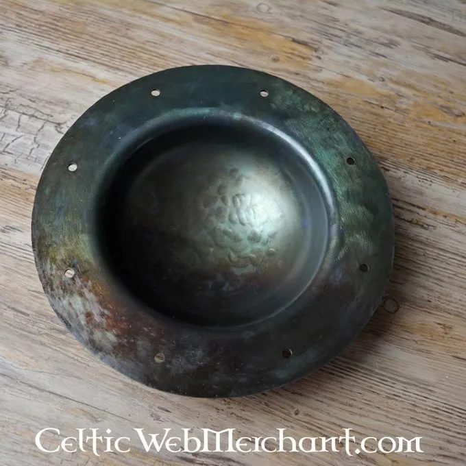 Denne runde skjoldboss er slået i hånden. Den er lavet af 2 mm tykt stål og har en diameter på 20 cm. Den indvendige diameter er 13,5 cm.