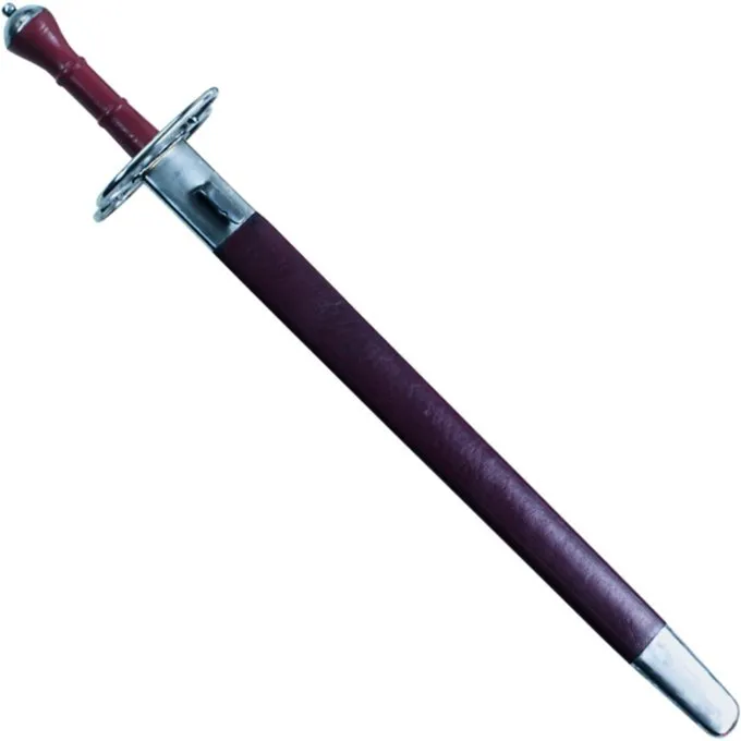 Detaljer: Materiale: kulstofstål, træ, læder; Bladlængde: ca. 61 cm; Total længde: ca. 79 cm; Kant: halvskarp; Sharp tip; Grip: træ; Leveres inklusiv scabbard; Fuld tang konstruktion; Baseret på en historisk original: ja Transportvægt (gram): 2000 “*