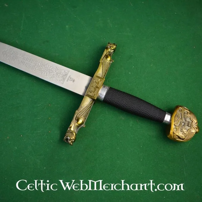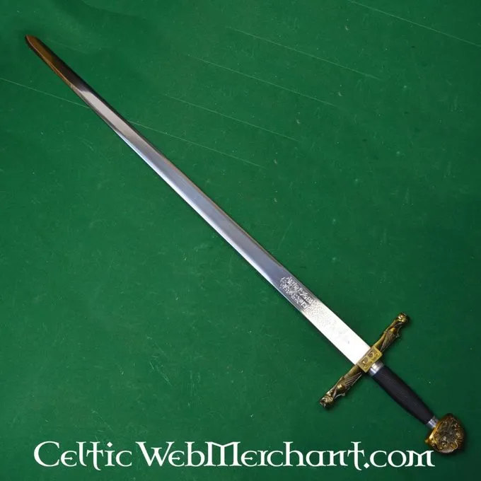 Dette er en smukt dekoreret sværd med en indgraveret blad, Knap og cross-vagt. Grebet er færdig med messing detaljer. Længden af sværdet er 100 cm. Den er lavet af Toledo stål.