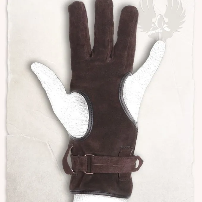Denne handske er ideel til at bære under bueskydning, for begyndere og avancerede bueskytter. Den er lavet i middelalderens stil og ser flot ud med en reenactment eller LARP outfit. Handsken dækker 3 fingre, således at tommelfingeren og lillefingeren har fuldstændig frihed flytning.De forskellige håndled har en strop til fastgørelse af handsken. Handsken er lavet af ruskind, den er fleksibel og stærk. Kanterne er pænt færdig med en søm. Handsken er til rådighed for den højre og venstre hånd og i 3 størrelser. Mål afstanden mellem din pegefinger og din lille finger på håndfladen. Størrelse S: op til 9 cm brede, størrelse M: op til 11 cm bred, størrelse L: op til 13 cm bred.