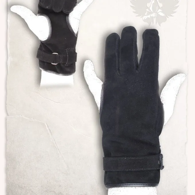 Materiale: ruskind / Farve: sort / Størrelse: S op til L / Levering: per styk / Egnet til bueskydning / Fås i venstre hånd og højre hånd udgave / Baseret på en historisk original