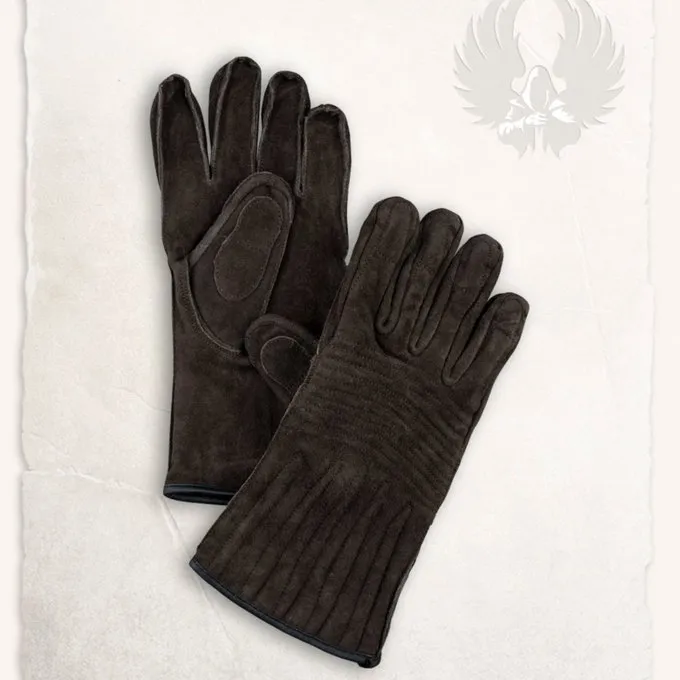 Gode handsker til sværdkamp, HEMA, reenactment, larp og uddannelse. Disse handsker er lavet af høj kvalitet og robust ruskind. De er meget velegnet til kampe, fordi de er polstret og forstærket på indersiden. Samtidig, det bløde materiale føles behagelig på huden. Disse handsker fås i 3 størrelser. Mål afstanden mellem din pegefinger og din lille finger på hånden håndfladen. Størrelse S: op til 9 cm brede, størrelse M: op til 11 cm bred, størrelse L: op til 13 cm bred.
