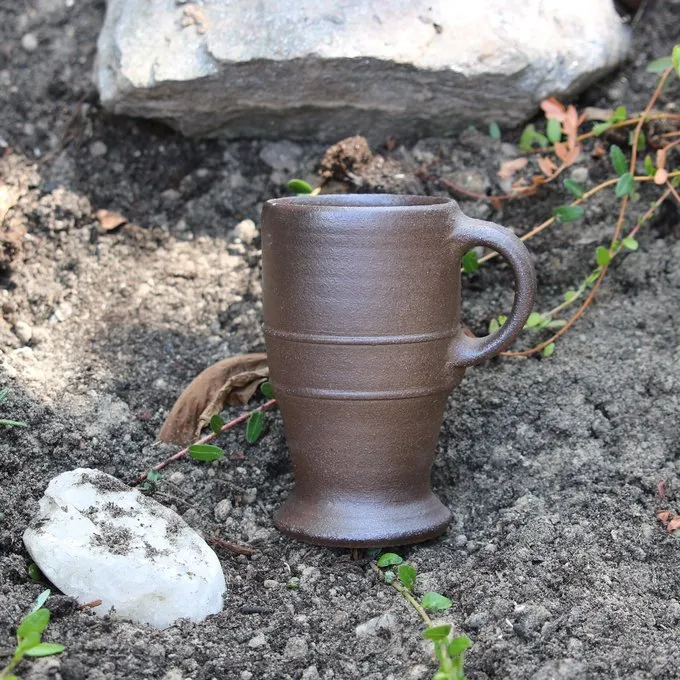 Dette bæger er en kopi af 15. århundrede originaler, der blev brugt af alle klasser i samfundet i hele Europa. Koppen har et håndtag og stiliserede dekorationer, en kontrast fra det 14. århundrede keramik. Koppen er fuldstændig håndlavede og er velegnet til det 15. århundrede reenactment og levende historie.