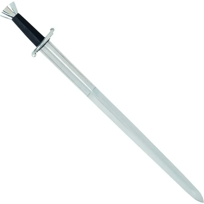 Detaljer: Materiale: kulstofstål, læder; Bladlængde: ca. 68 cm; Total længde: ca. 85 cm; Kant: skarp; Sharp tip; Grip: sort læder; Herunder sort læder skind; Fuld tang konstruktion; Baseret på en historisk original: ja Transportvægt (gram): 2000 “*