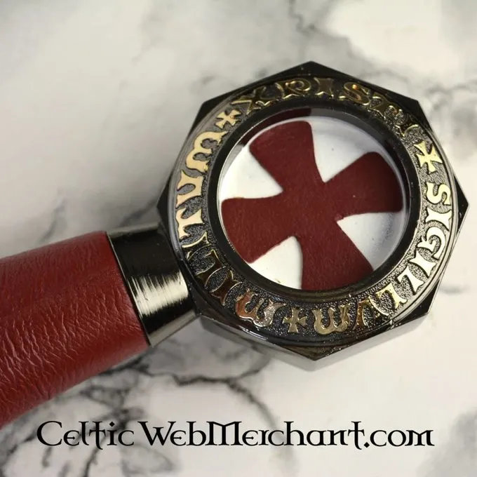 Denne Tempelridder sværd er lavet af Toledo stål. Dens længde er 107 cm, og det er rigt udsmykket. Den har en smuk åben Knap, der giver det en kraftfuld, men elegant udseende. Enderne af cross-vagter har løvehoveder.