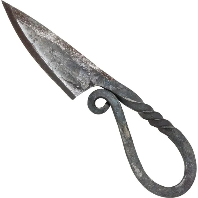 Denne replika er smedet af karbonstål og har et snoet greb med en krølle i enden. Den leveres med en læderkappe, som har en løkke, så du kan hænge den på bæltet eller rundt om halsen. Et godt tilbehør til middelalderlige re-enactors, LARP, museer eller samlere af historiske knive.