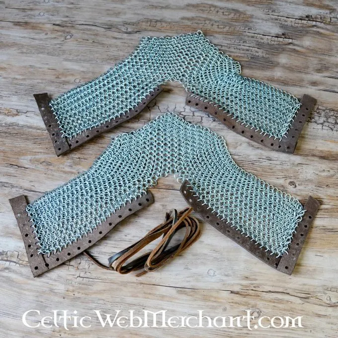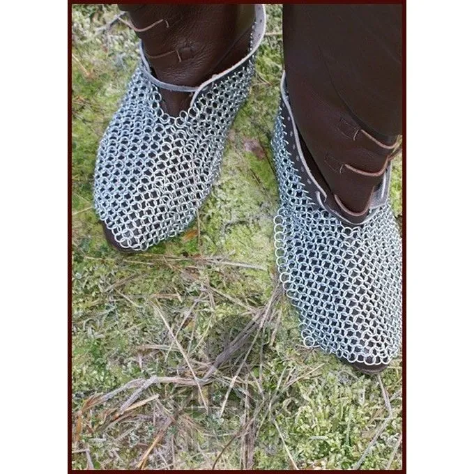 Disse kæde mail sabatons kan nemt bæres over historisk fodtøj. De er lavet af galvaniseret gathered Runde ringe med en indre diameter på 8 mm. De forlader den eneste åbne og på oversiden de har en læder kant