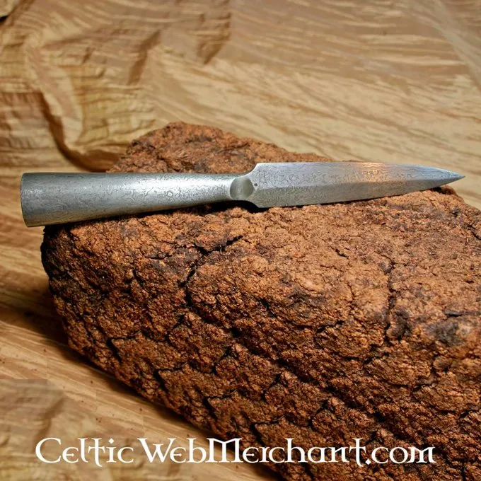 En masse tidlig middelalder spydhoveder var lavet af damaskusstål. Spidsen blev lavet af flere lag stål, der blev vævet sammen. Denne spydhoved er autentisk lavet. Det er en kopi af en 6. århundrede South germansk spydhoved, men lignende originaler forekom indtil det 10. århundrede.