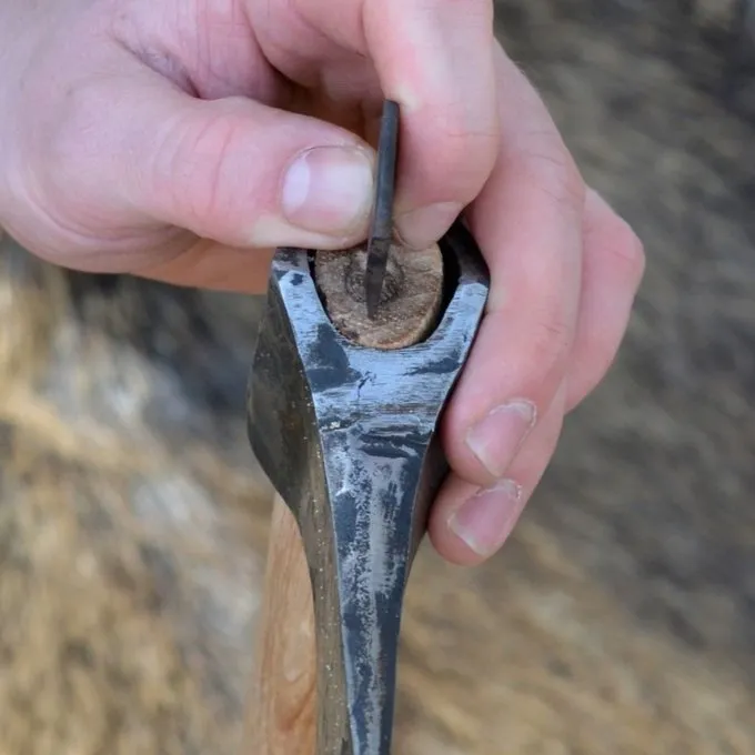 Efter intensiv brug, kan øksehoveder løsne sig fra akslen. Du kan vedhæfte øksen hoved til akslen med denne kile. Kør kile ind i toppen af træ skaft i retning af kornet. Dette udvider træet, hvilket sikrer en stram pasform af axehead. Denne kile er lavet af hånd-smedet stål.