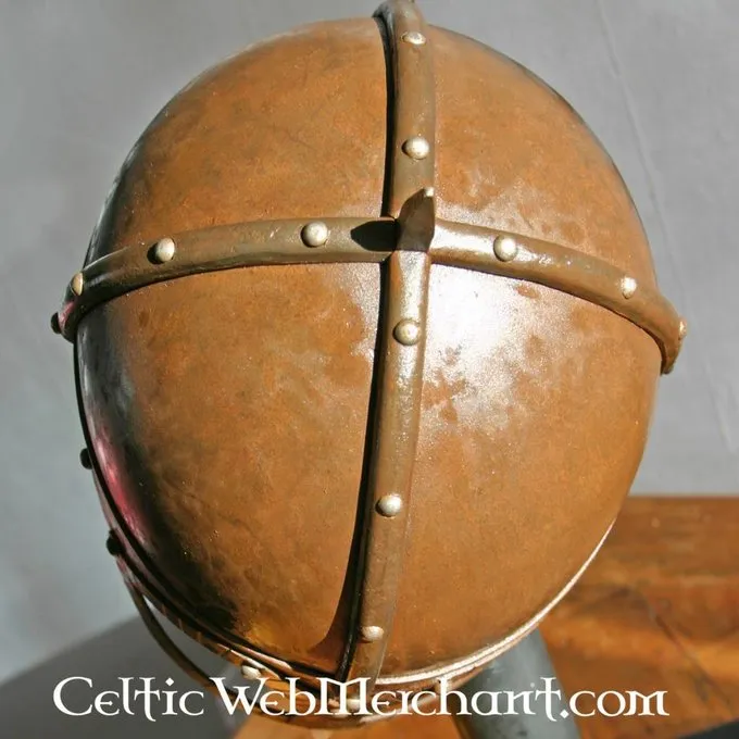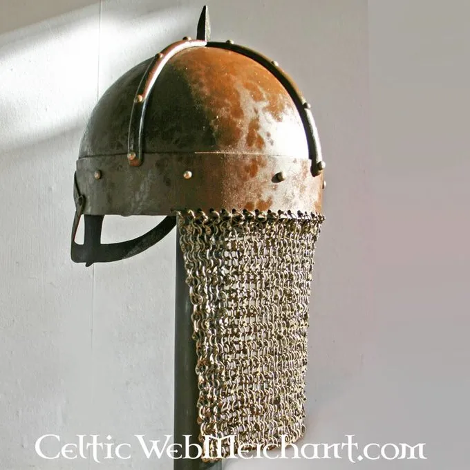 Denne hjelm er lavet af 2 mm tyk stål. Det er upoleret og formørket som originalen. Beskyttelsen chainmail Halsen består af nitteed runde mail ringe. Denne hjelm er velegnet til en Hovedets omkreds op til 62 cm. Det vejer ca.. 2,9 kg.