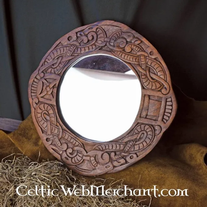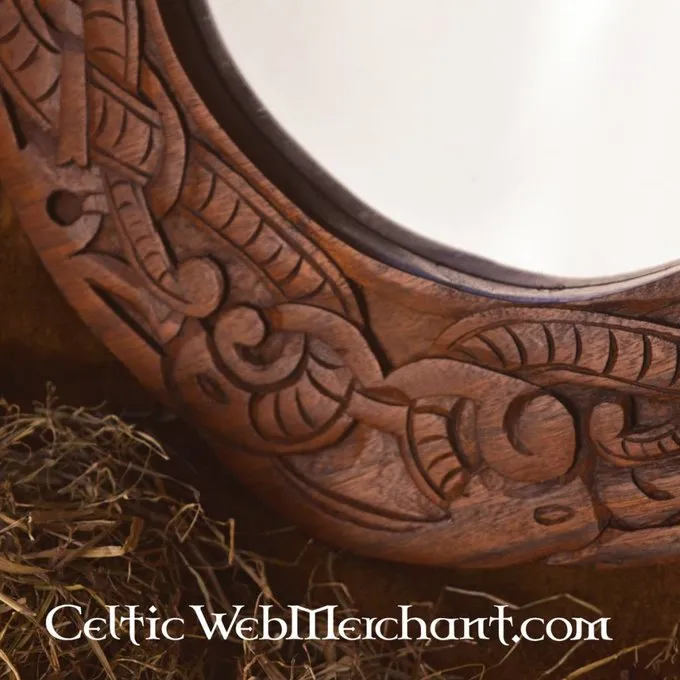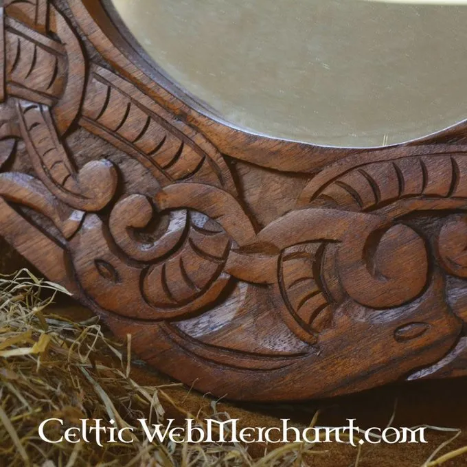Denne smukke spejl er lavet i Urnes stil. Håndskårne Viking drager omringe dette spejl. Dragerne er flettet sammen i en knude motiv. Spejlet er helt funktionelle og måler ca.. 40 x 40 cm. Den vejer 1,2 kg.