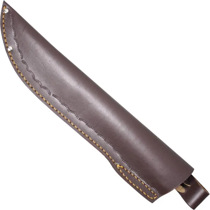 Materiale: kulstofstål, træ, læder, horn, messing / / Kant: knivskarpt / / Længde: 38 cm / / Blade længde: 24 cm / / Leveres inklusive læderskede / / Baseret på en historisk original