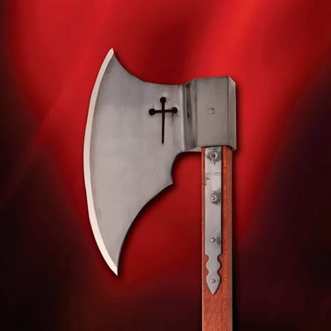 En smuk økse af ankerspil Steelcrafts, baseret på middelalderlige akser, at korsfarerne anvendes under deres korstog til det hellige land. Middelalder akser var egnet som et våben til gennembore plade rustning, men også at blive anvendt som redskaber farten til kamp. Den store økse hoved med pasning er solidt fastgjort til akslen med søm. Grebet har sort læder indpakning og er behageligt i hånden. Alle metaldele har en patineret overflade, så det ser ligesom en antik økse. Denne økse er lavet af semi-skarpe 1065 kulstofstål hærdet til en hårdhed på 48-52 HRC. Den leveres med en læder skede. En dejlig middelalderlig økse til din samling eller til middelalderlige reenactment. Når du blunten øksen, kan du bruge det til reenactment slag.