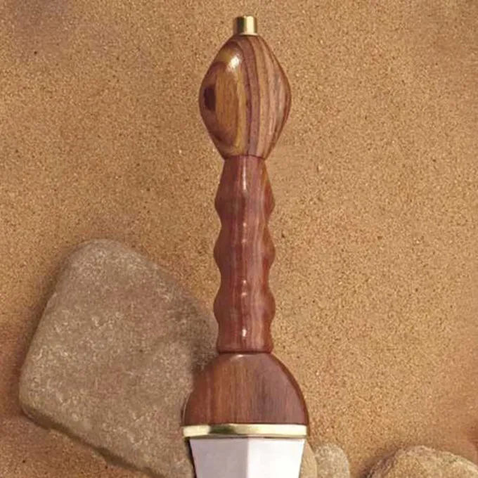 En smuk pugio med skede af ankerspil Steelcrafts, baseret på en original i British Museum. Den pugio var en dolk, at romerske legionærer bruges til nærkamp. Disse typer af romerske dolke var ikke normalt bæres af civile, men forhandlere og andre rejsende gjorde bære en pugio på vejen. På den måde kunne de beskytte sig mod barbarer på kanten af ??det romerske imperium eller imod røvere. Denne pugio har en træ greb og skeden er dekoreret med messingbeslag og ringe til at hænge den i bæltet. Klingen er lavet af hærdet 1055 carbonstål med en hårdhed på 48-52 HRC. Perfekt til reenactment af en romersk legionær, en romersk kostume eller for samler af romerske våben. Når du blunten den pugio, det er egnet til reenactment slag.