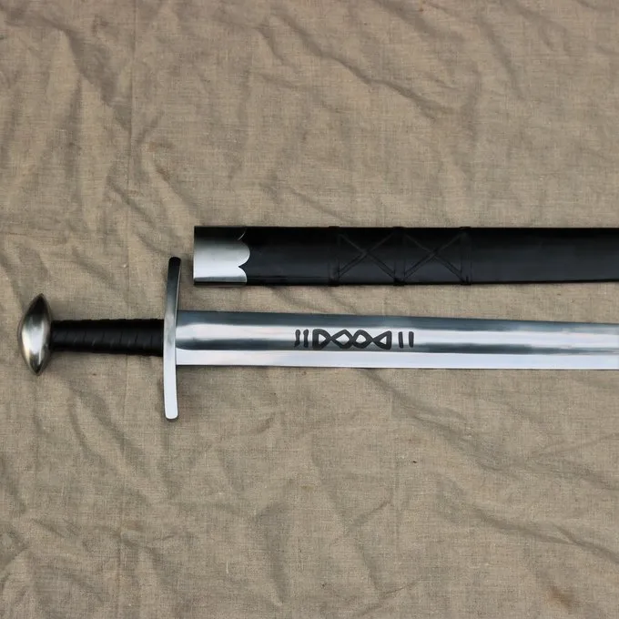En replika sværd baseret på en original historisk sværd fra vikingetiden. Ulfberht sværd er ca.. 170 sværd fundet i Europa i vikingetiden og graveret med VLFBERHT. Dette er et frankisk navn. Det er sandsynligt, at Ulfberht er et tegn på høj kvalitet, der anvendes af smede, der kunne levere denne kvalitet. Disse tidlige middelalderlige sværd blev smedet i Rheinland. De fleste Ulfberht sværd kommer fra Finland og Norge. Vikingerne begravede dem i gravene af velhavende Viking krigere, hvilket er grunden til de sværd i nord er velbevarede. Dette Viking sværd leveres inklusive en skede. Klingen er smedet fra 1065 kulstofstål og hærdet til en hårdhed på 48-52 HRC. En smuk dekorative sværd til på væggen, eller til din Viking kostume. Når du blunten bladet, det er en stor træning sværd for sværdkamp eller til historiske europæiske Martial Arts. Du kan også bruge det til Viking reenactment slag.