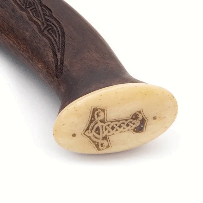 En smuk luksus håndøks fra Windlass Steelcrafts lavet af rustfrit stål. Skaftet er lavet af sissoo-træ og er dekoreret med Viking-udskæringer i form af tidlige middelalderlige knotmotiver. Bagsiden af Vikingøksen har en knogleornament med en ætsning af en Mjolnir eller Thors hammer. Dette er det frygtede våben fra den vikingetiske tordengud Thor. Det halvskarpe øksehoved er lavet af rustfrit stål X46Cr13 med en hårdhed på 52 HRC og er velegnet til intensiv brug. Øksen leveres med en læderkappe og en luksusopsamlerboks foret med kunstig pels. Du kan bruge håndøksen som et værktøj eller vise den.