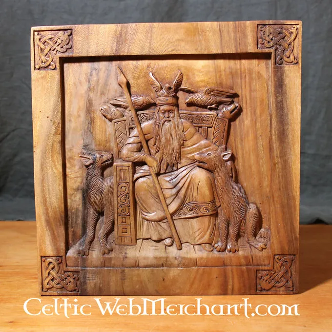 Denne Viking træskærearbejde viser Viking gud Odin. Han sidder på sin trone; på sine sider er ulvene, som altid hjulpet ham: Gere og Freke. Ravnene der altid informeret Loke, hvad der skete i verden, er også afbildet på denne detaljerede træskærearbejde. Hjørnerne af udskæringen er færdig med Urnes stil elementer.
